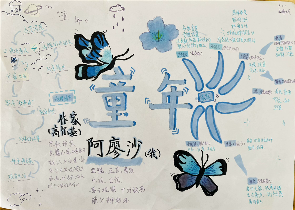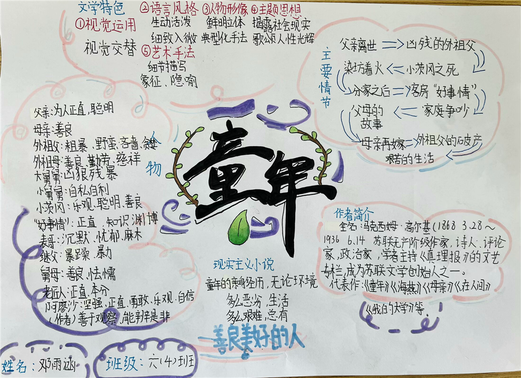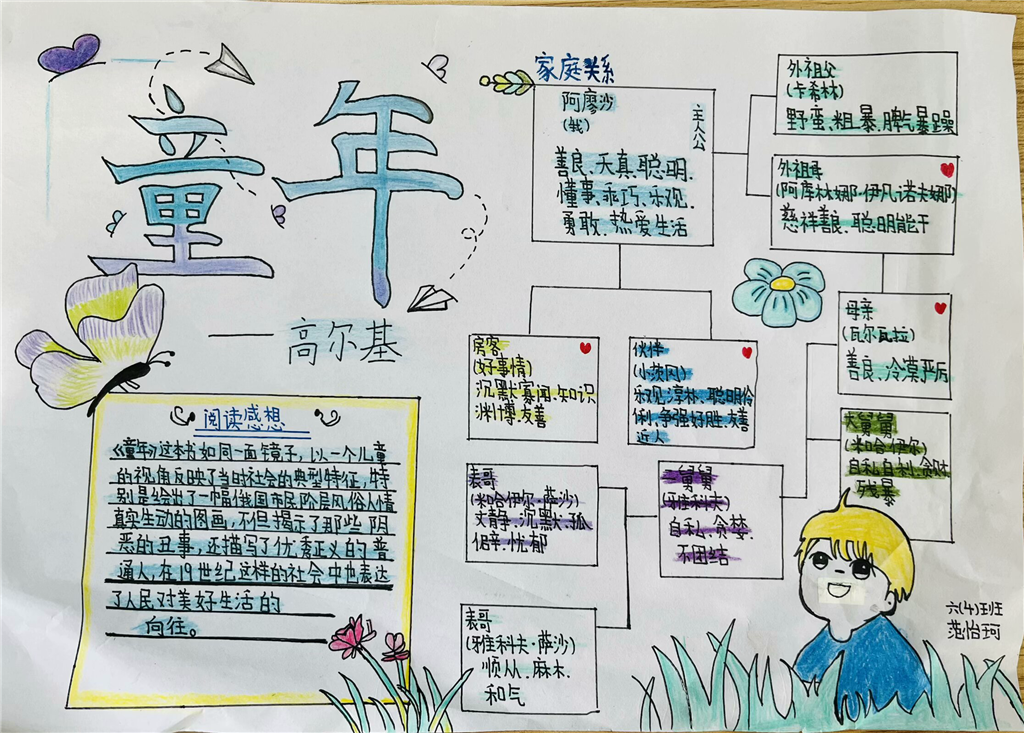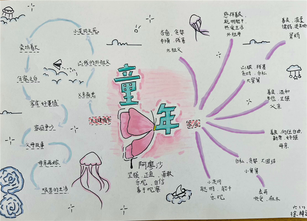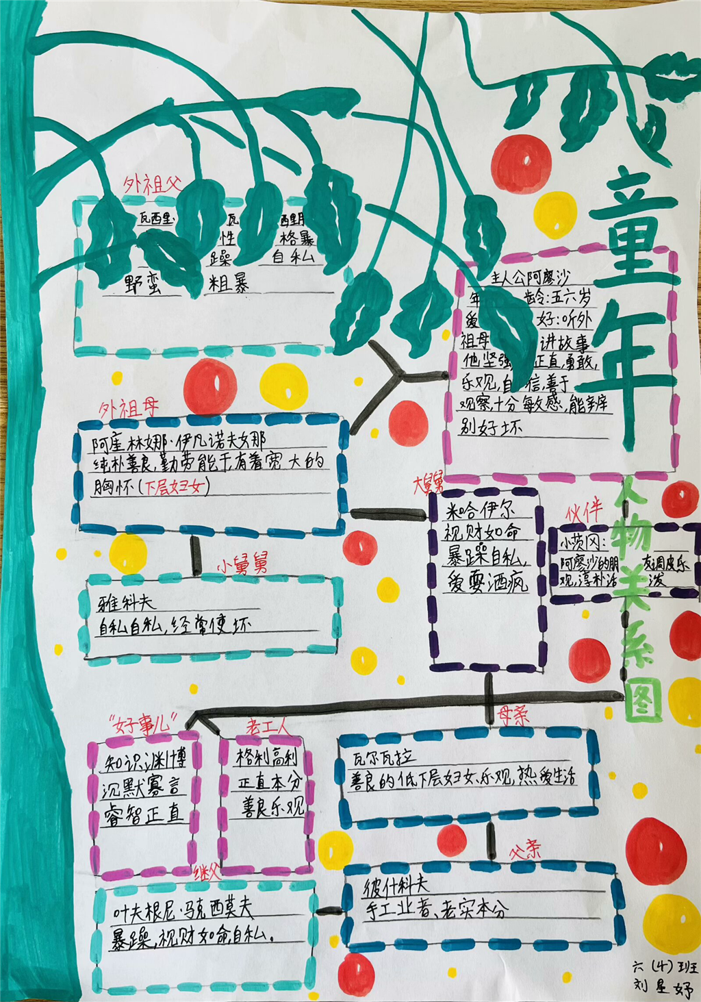 在阅读中,孩子们梳理故事情节思维图,画人物关系网,近距离地走进人物,体会人物的内心世界。性格坚强的阿廖沙,善良智慧的外祖母,命运悲惨却乐观淳朴的小茨冈,正直的老工人格里戈里……一个个有血有肉的人物形象独具性格,将最真实的一面呈现给读者,也让孩子们在阅读中走近人物,感知人物。