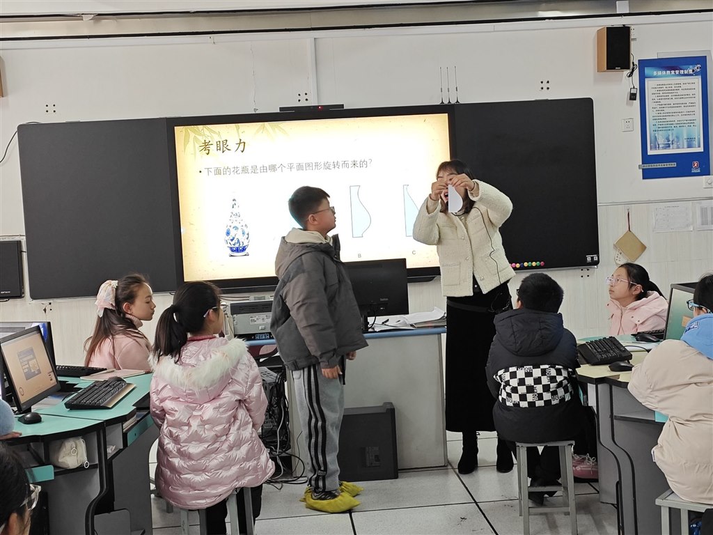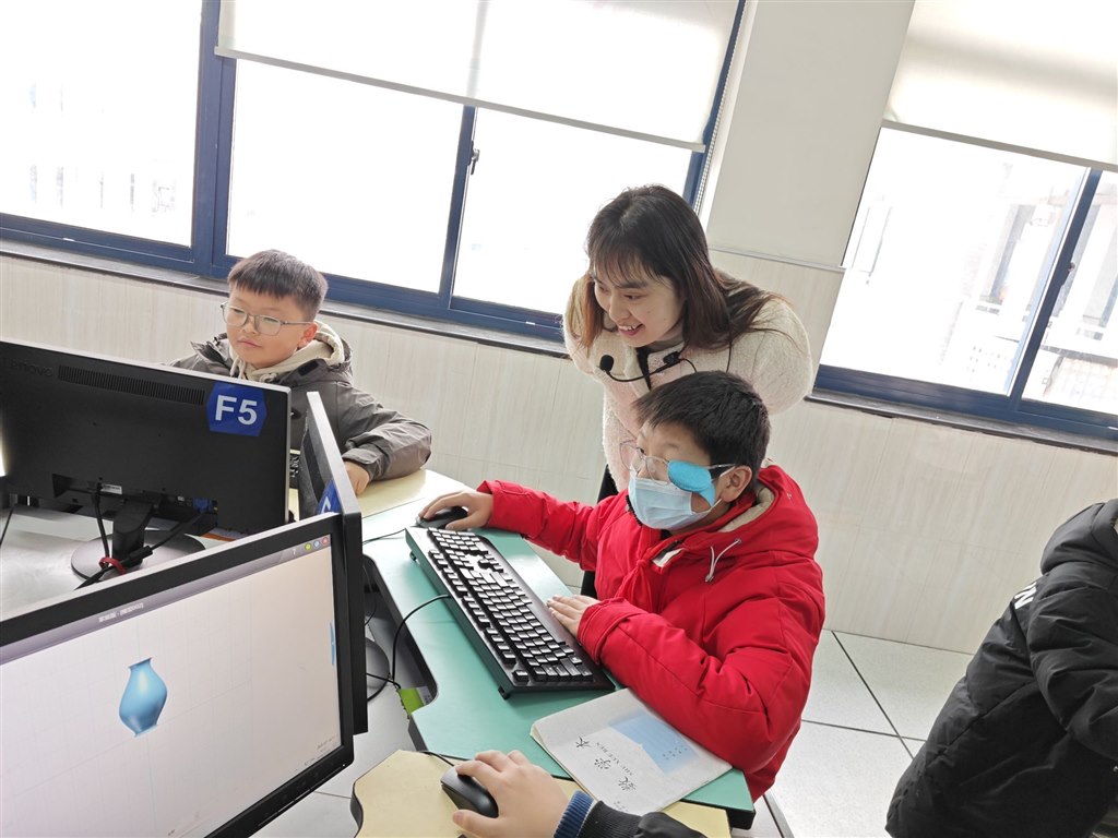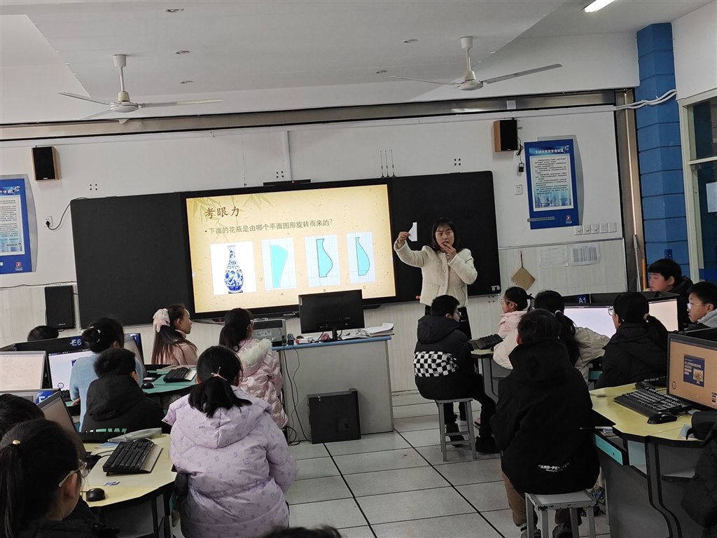 活动中由杨凤老师执教一节六年级信息科技课,题为《中国传统瓷器——设计花瓶》。课的开始由一段纪录片视频《China瓷》导入,由此激发学生的兴趣,自己也来绘制一个青花瓷瓶。接着教师带领同学们一起来分享瓷瓶的共同外形特征,发现瓷瓶都是轴对称图形,也就找到了绘制瓷瓶的方法,先绘制瓷瓶的平面图形再通过对称轴旋转形成立体图形。最后同学们利用3Done软件开始创作。在这个过程中,学生从掌握基本的技能到创意的产生,都立足于培养学生的创新能力和探究精神。