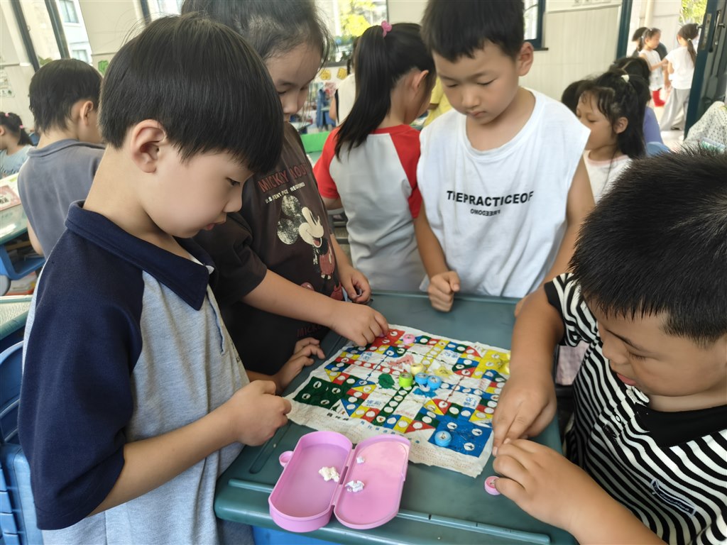 课间时,孩子欢快地和新认识的朋友玩棋类游戏,在健康、有趣的课间游戏中培养团结协作、互助互爱的情谊,增强规则意识。