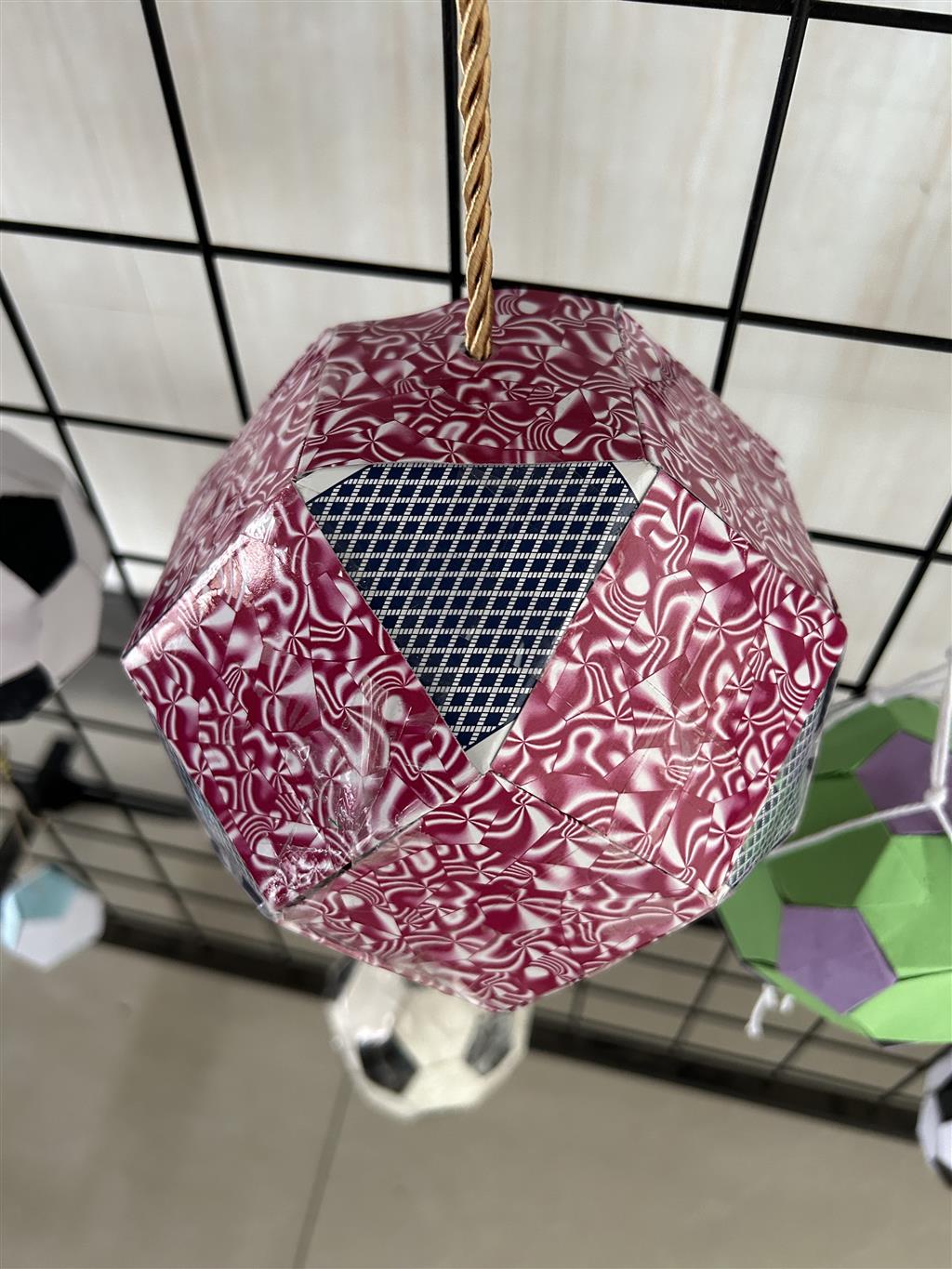 学生们化身“小小研究员”,先通过查阅资料了解苏超联赛文化,再运用数学知识测量足球周长、直径,估算表面图形数量与表面积,精准记录数据并完成计算。美术创意环节里,大家结合苏超球队元素或个人想法,设计独特图案,用彩笔为裁剪的正多边形上色。随后,学生们细心拼接图形,将数学测量结果、美术设计理念与科学球体结构知识融合,打造出专属“苏超之星”足球。