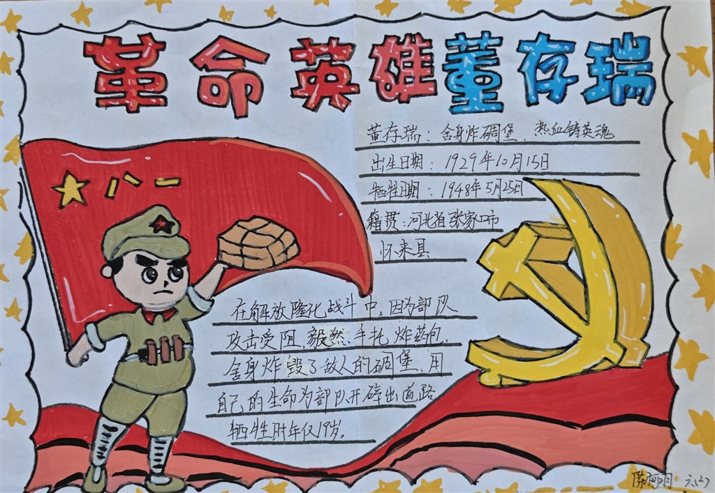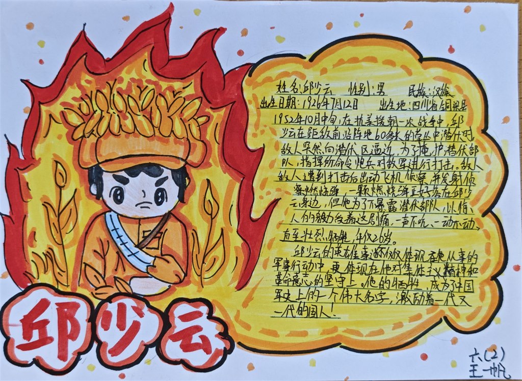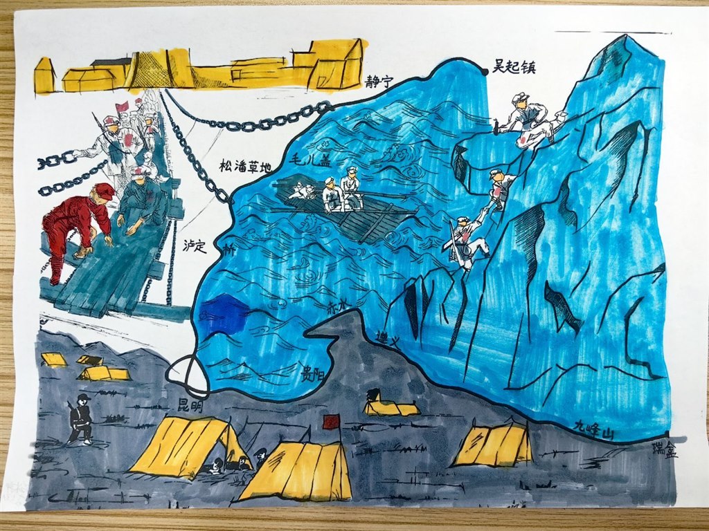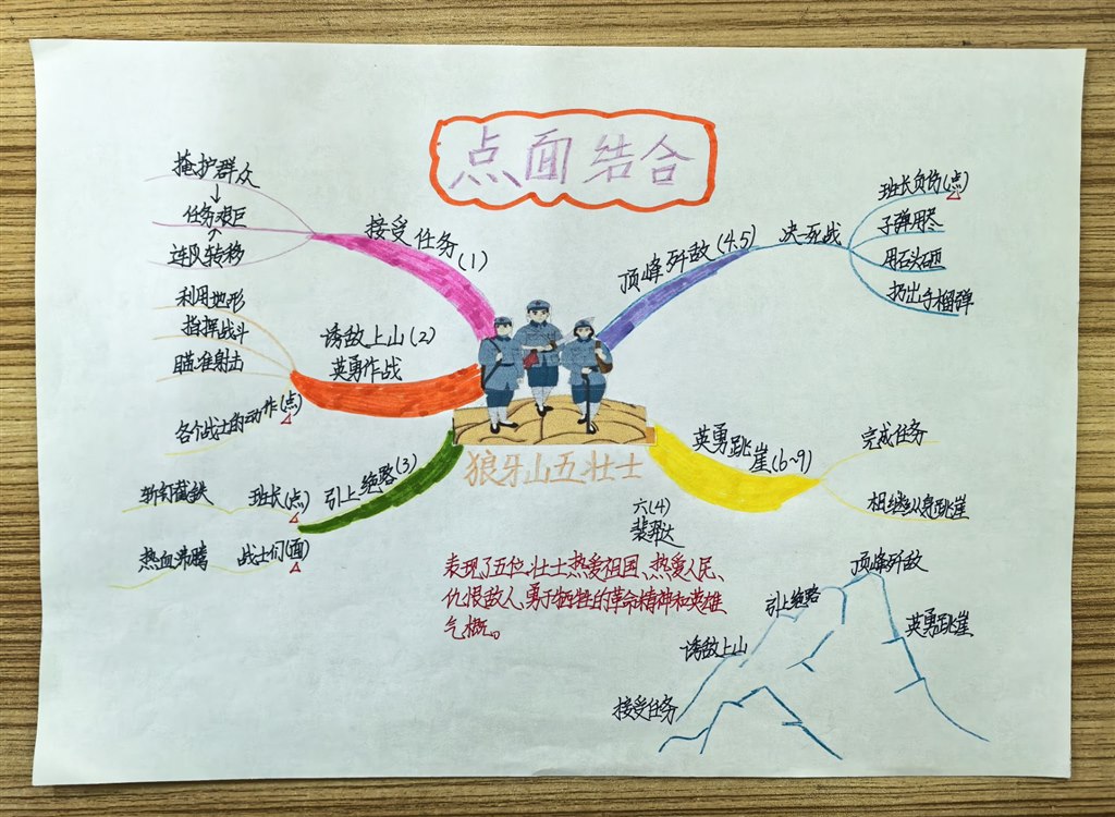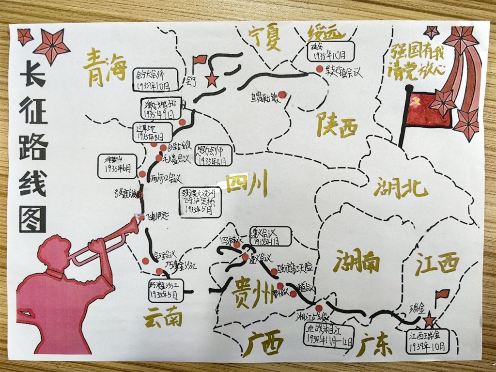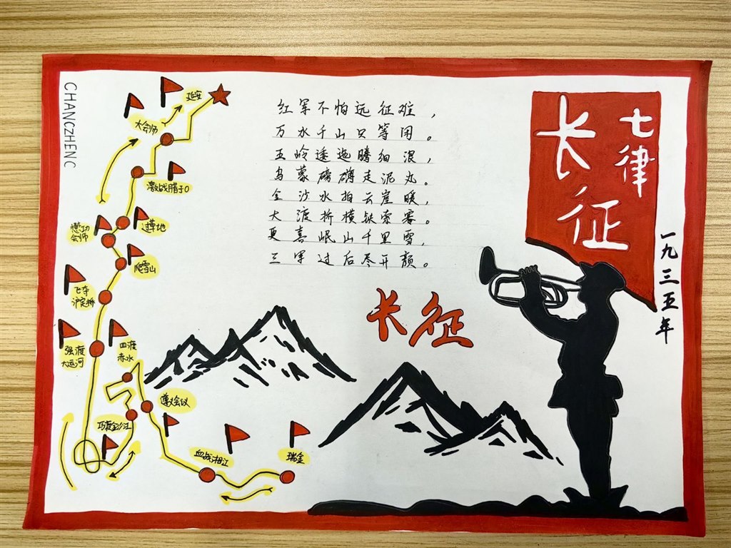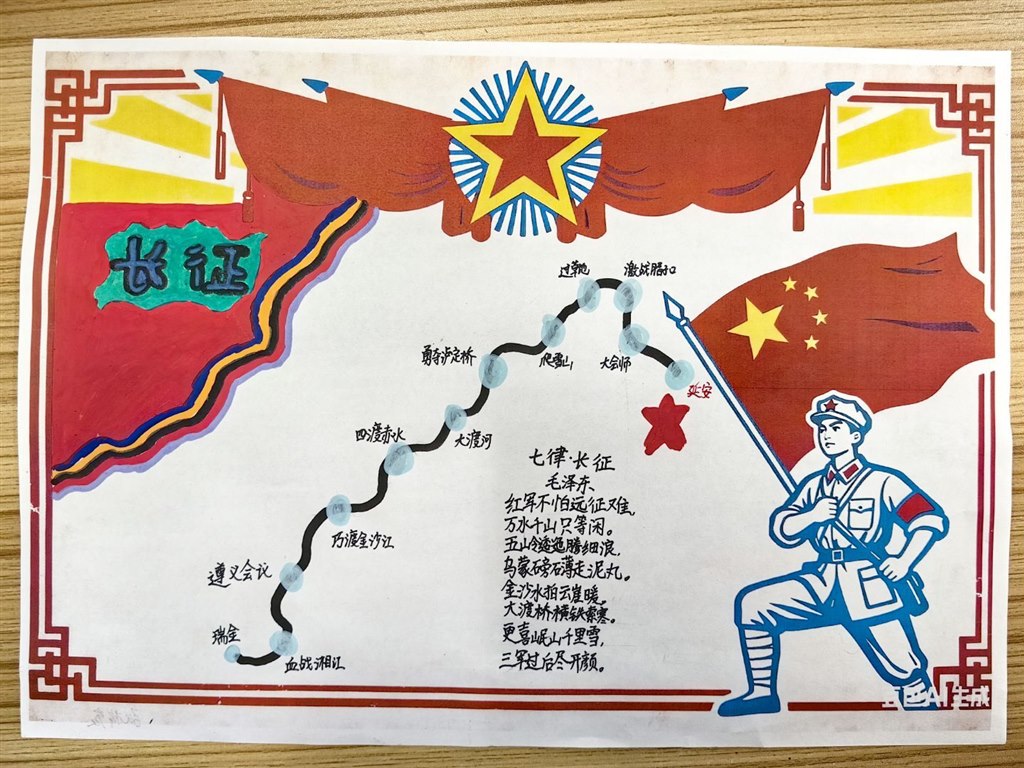 同学们自主动手实践,有的搜集革命英雄的经典语录和名言诗句,将文字与插画结合,制作出一张张图文并茂的书签,每一张书签都成为传递红色精神的小小载体;有的通过反复研读课文、查阅课外资料,深入了解英雄人物的生平事迹与精神品质,用简洁的文字梳理狼牙山五壮士的战斗历程,用色彩勾勒邱少云在烈火中坚守的坚毅形象,将英雄故事浓缩在一张小小的名片上,既锻炼了信息整合能力,更在创作中加深了对英雄的崇敬之情;有的以《七律·长征》为线索,对照历史资料标注出红军长征途经的湘江、乌江、大渡河、雪山、草地等关键地点,用箭头串联起二万五千里的征程,直观感受长征的艰难与红军战士的顽强意志。