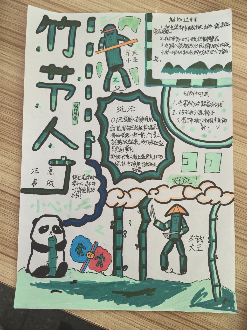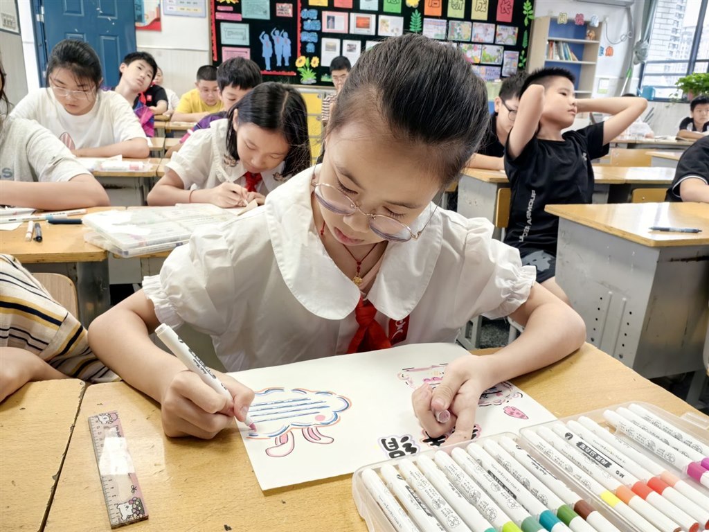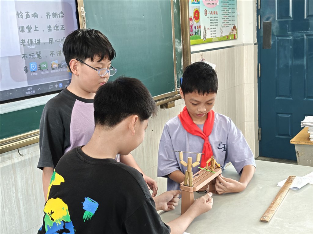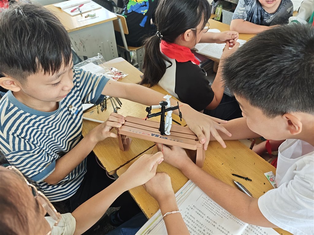 在老师的示范讲解下,学生们对照制作指南,动手裁剪、折叠、粘贴、组装。有的小组边合作制作沙包边讨论不同填充物的优劣;有的小组结合指南中的创意拓展,给竹节人添加了相关的“装备”;还有的小组发挥创意,为飞机添上了各种各样的花纹……当一个个亲手制作的传统玩具完成时,教室里充满了欢声笑语。