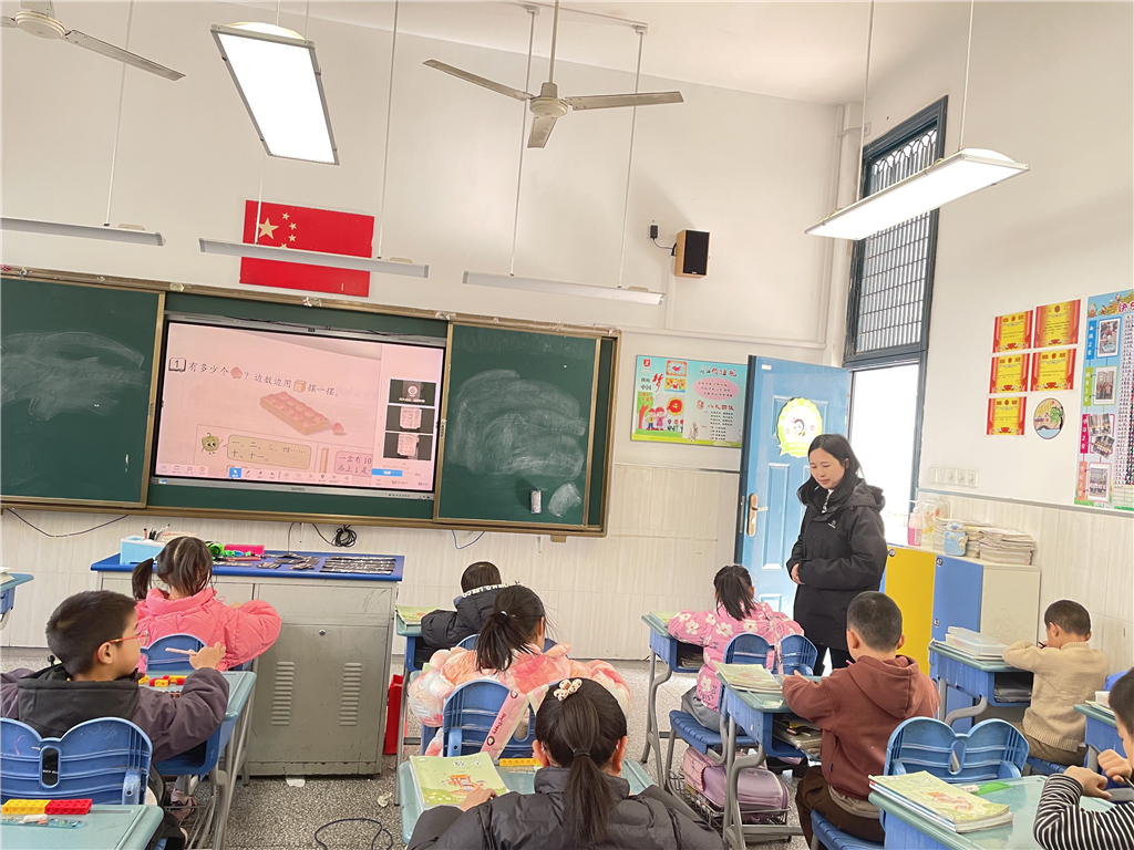 本次研讨课上,黄小科老师以“摆小棒”“拨计数器”为核心活动,引导学生从“10根小棒捆成一捆”的操作中,直观感知“1个十”的计数单位含义;通过“1捆加3根是13”“计数器十位拨1、个位拨5是15”等环节,帮助学生建立“1个十和几个一组成十几”的数结构认知。课堂中,黄老师还设计了“数文具”“填数序”等练习,让学生在实际情境中巩固数的读写与大小比较,同时渗透“数是数量抽象”的数学思想。
