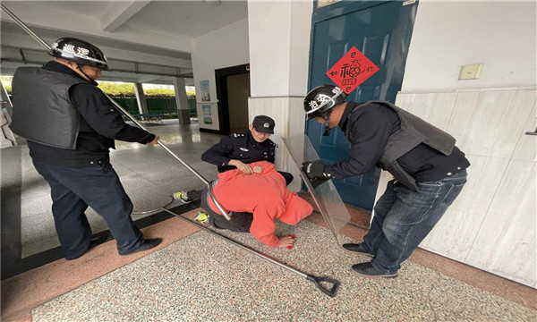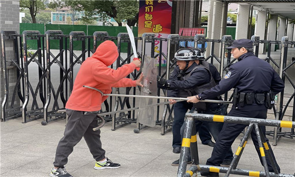 与此同时,学校安保人员与应急处理小组第一时间启动应急预案。安保人员手持防暴器械,迅速赶往“事发”区域进行先期处置与周旋,为后续措施争取时间。各楼层安全岗教师迅速就位,确保通道畅通与信息传递。演练还模拟了报警、校内广播预警、人员清点等环节,全面检验了学校应急预案的可行性和各部门的协同联动能力。