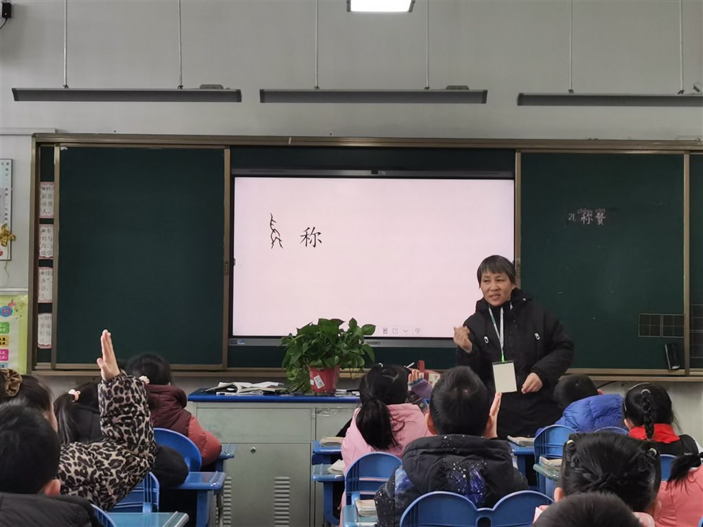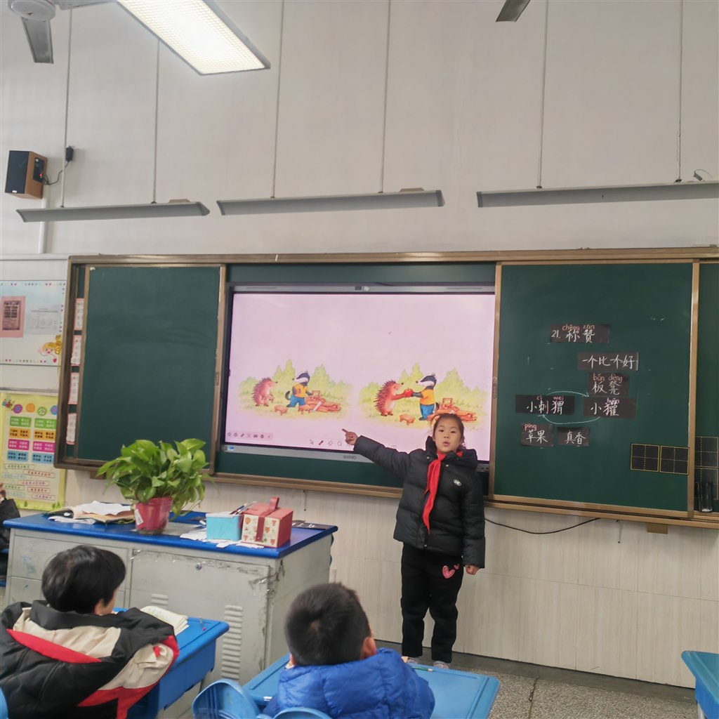 二3班的王老师则执教了《称赞》一课,以生为本,层层深入,尽显语文课堂的人文温度。课堂伊始,王老师紧扣单元主题导入,从“称”字的字源出发,结合生活实例引导学生理解词义、梳理近义词,并鼓励学生围绕课题提问,激发探究兴趣。初读课文环节,王老师明确要求,引导学生读准字音、标注自然段序号,梳理故事中“谁称赞了谁?称赞了什么?”的主线,借助小刺猬与小獾的角色,识记“刺、猬”等二会字,辨析“板凳”与“椅子”的区别。随后,王老师重点指导学生掌握“不出声、不指读”的默读方法,探讨称赞带来的“自信”与“消除疲劳”的力量,通过分角色朗读、借助板书梳理故事大意,让学生深刻体会称赞的意义。课堂最后,王老师设计识字游戏巩固生字,并对“极、椅、拉、接”等左右结构的字进行书写指导,夯实学生的写字基础。