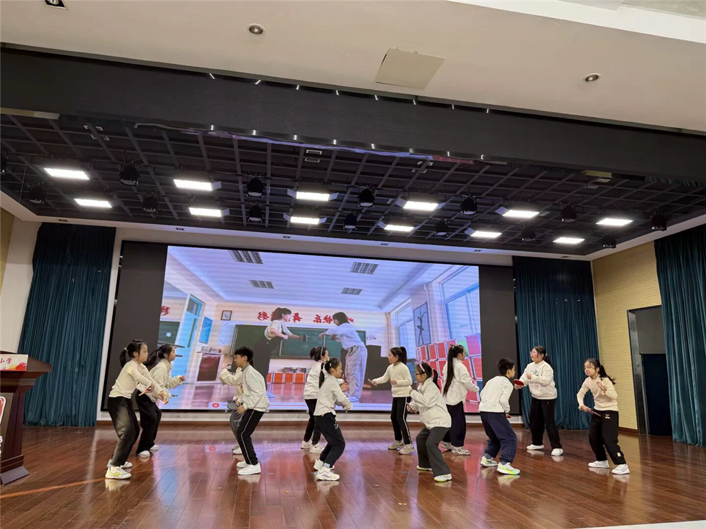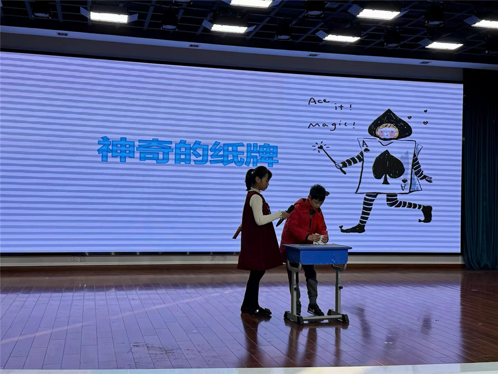 乒乓嘉年华庆典更是将活动推向高潮。伴随着欢快的音乐,四(3)班的同学们带来舞蹈《快乐的歌》,灵动的舞姿、饱满的热情瞬间点燃全场气氛,为庆典拉开精彩序幕。紧接着,四(4)班的魔术《神奇的纸牌》惊艳登场,普通的纸牌在小小魔术师手中变幻出别样乒乓趣味,引得台下掌声与欢呼声不断。随后,相声《乒乓小达人闯关记》幽默上演,同学们用生动的语言、默契的配合,讲述乒乓小达人的趣味闯关故事,让全场忍俊不禁。四(2)班的同学身着靓丽服装,踏着动感节拍翩翩起舞,四(1)班用活力舞姿诠释乒乓精神,你看,他们的乒乓操表演整齐划一,同学们动作舒展、精神抖擞,展现出少年儿童的蓬勃朝气。