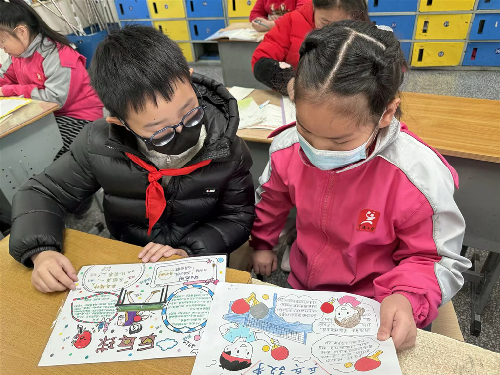 课程中,四年级围绕“快乐乒乓伴我成长”主题,将乒乓元素与各学科教学巧妙结合,打造了一场别开生面的知识盛宴。语文课上,同学们追溯中国乒乓发展史,分享乒乓明星的励志故事,亲手绘制“校园乒乓故事”连环画,用文字与画笔记录对乒乓的热爱;数学课上,大家化身“小小数学家”,借助乒乓球探究不同角度斜坡的滚动距离,设计颠球接力统计表格,在实践操作中深化对速度、数据的理解;英语课上,“I love China,I love pingpong”的口号此起彼伏,同学们制作乒乓主题励志书签,用英语写绘抒发对国球的喜爱。美术与信息技术课上,同学们尽情挥洒创意,用彩泥DIY乒乓造型,设计“乒乓创意数字画”,勾勒出心目中的乒乓校园;音乐课上,《银球飞舞花盛开》的旋律回荡在教室,同学们改编融入乒乓元素的手势舞,在歌声与律动中传递乒乓热情;科学课上,大家探究乒乓球滚动原理,尝试制作简易发球机,在“快速抓乒乓球”游戏中锻炼反应能力,感受科学与运动的奇妙关联;体育课上,颠球接力赛、乒乓操训练热火朝天,同学们在奔跑与协作中锤炼意志,培养团队精神,深刻体会乒乓运动的乐趣。