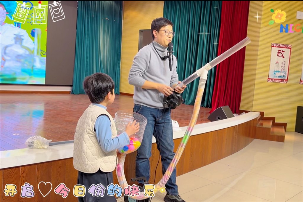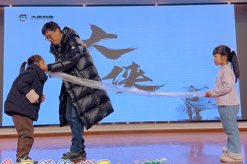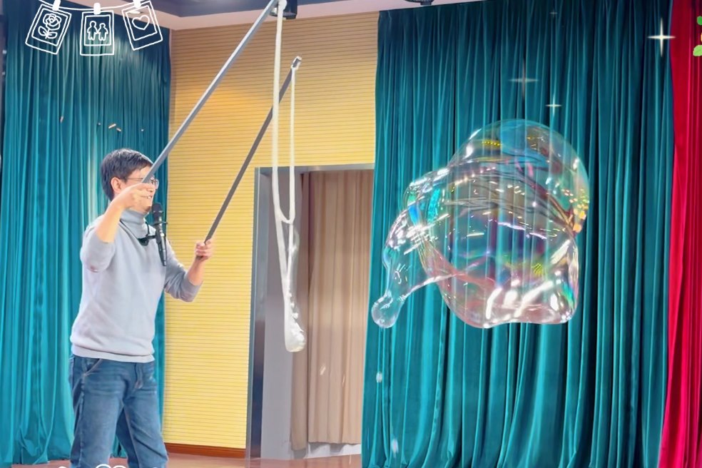 活动高潮在梦幻光影中到来。“大侠”老师的“魔法泡泡秀”惊艳全场,巨型泡泡轻盈飘荡,甚至能笼罩同学。在惊叹声中,老师引导大家思考泡泡不易破裂的原因,揭示表面张力的奥秘,让孩子们在童话场景中窥见液体微观世界的奇妙。